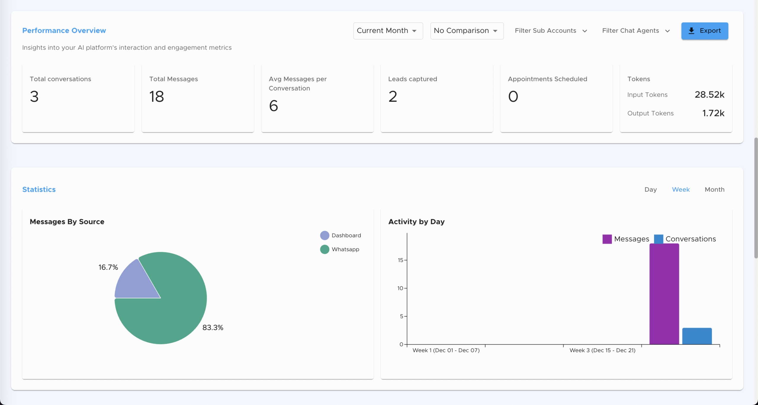 Obtén métricas claras sobre tus leads: de dónde vienen, cuántos mensajes se intercambian, volumen de conversaciones y rendimiento general. Datos simples para tomar mejores decisiones.