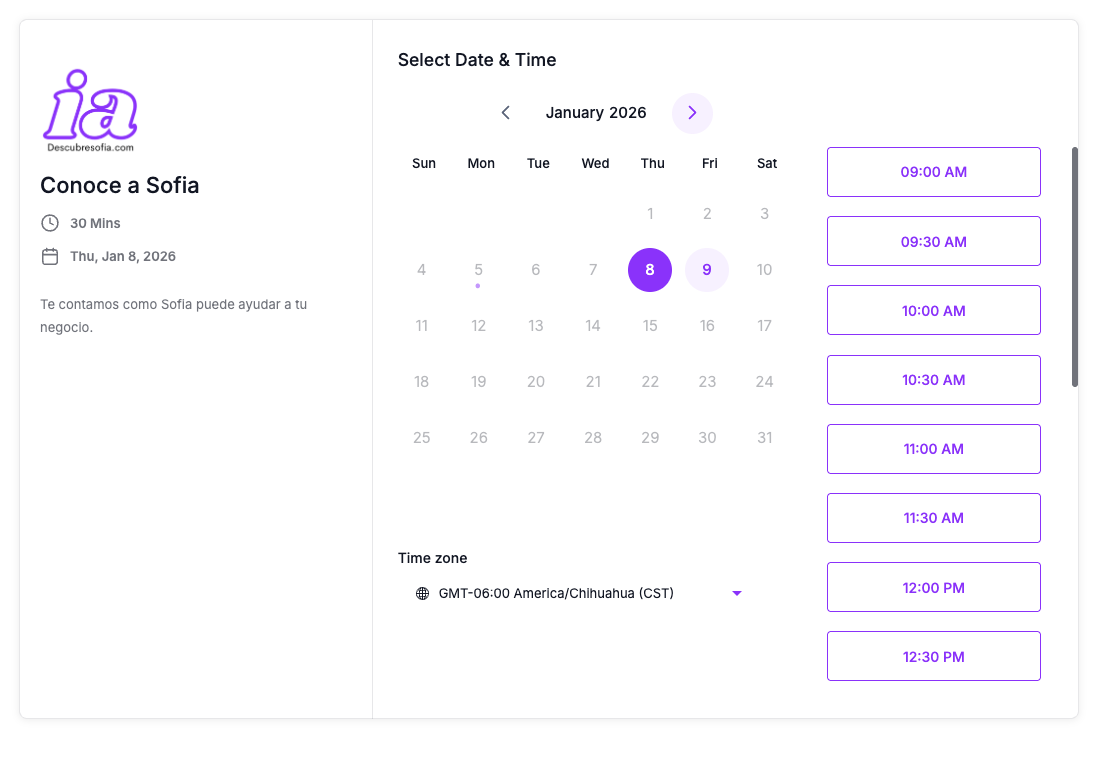 SOFÍA puede agendar citas automáticamente conectándose a tu Calendar y enviando links tipo Calendly. Así conviertes conversaciones en reuniones sin esfuerzo.